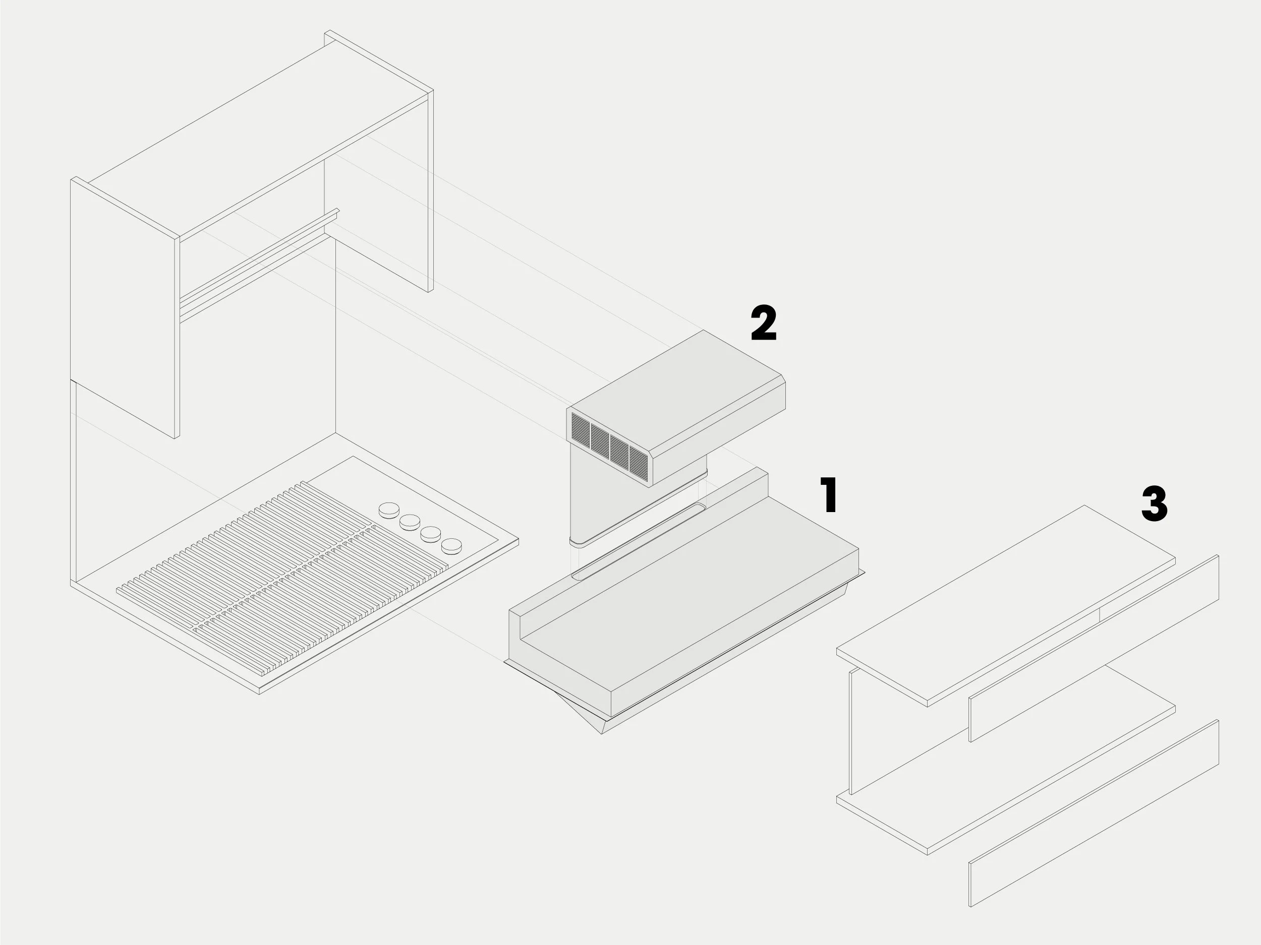 An effective way of hiding the complexity of an artifact is to greatly accentuate one of its characteristics so that the observer's attention is focused on that one only, overlooking the others. In this built-in hood we have made the entire visible part of the object become one big on/off switch. All the technological complexity introduces itself with an extremely minimal interface whose operation is of immediate intuition.
